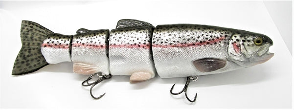 The bait is an ultra realistic swimming hard bait trout replica. It is made of an extremely durable resin.